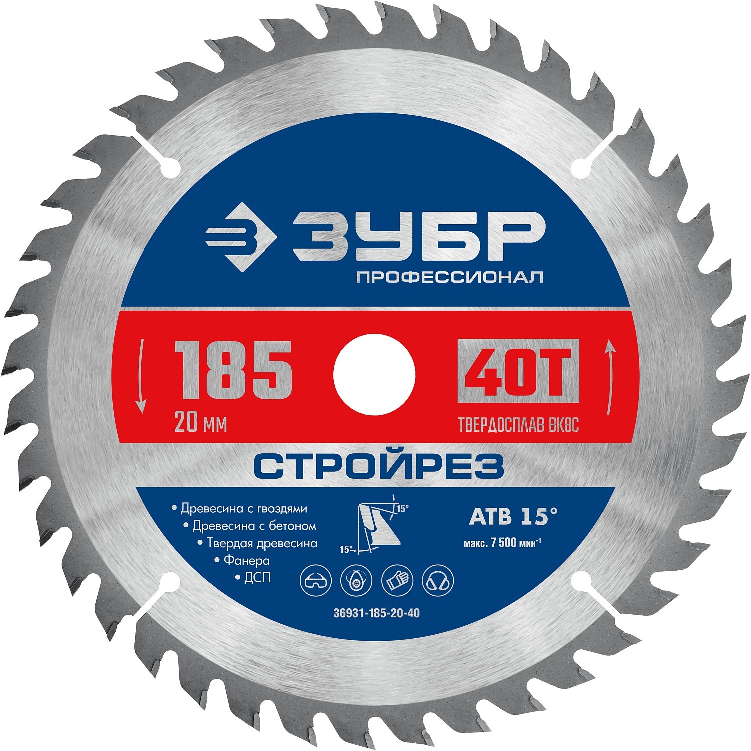 ЗУБР Стройрез, 185 х 20 мм, 40Т, пильный диск по строительной древесине, Профессионал (36931-185-20-40)